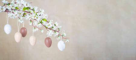 Natural not Colored Easter eggs hanging on branch with white flowers.