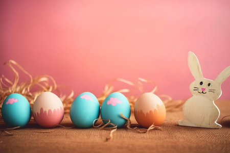 Painted eggs in pastel colors on a pink paper filler and background. Modern easter holiday template.