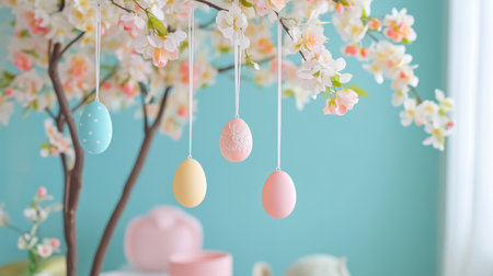 Easter egg tree centerpiece with hanging pastel eggs and miniature blossoms