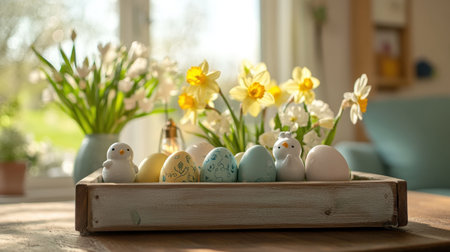 Wooden tray with painted eggs, ceramic chicks, and fresh daffodils on a coffee table