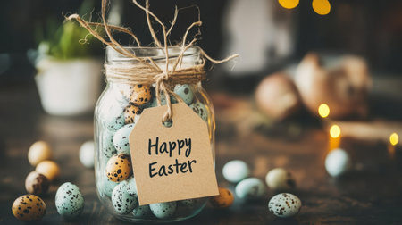 Jar filled with mini eggs and a tag labeled Happy Easter on kraft paper