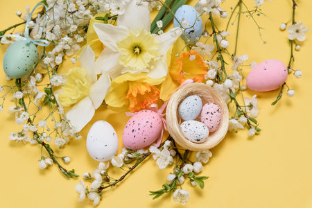 Spring Holiday Card Concept with Floral Arrangement. Flat lay of Easter eggs, spring flowers, and decorative nest on yellow background, greeting card concept with bright festive design