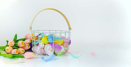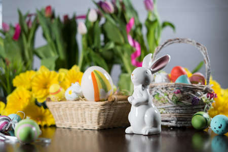 Easter theme. Easter decorations. Easter eggs in basket and easter bunny. Bouquet of spring flowers.