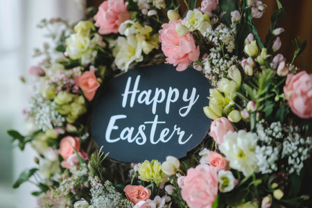 Beautiful floral wreath with a happy Easter sign in the center, perfect for Easter decorations