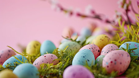 Colorful Easter eggs in a nest of twigs and flowers on a pink background