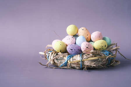 violet and yellow easter eggs in a nest with inscription Easter