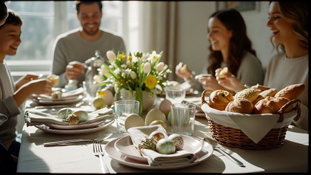A diverse family enjoying a festive Easter dinner together at the table
