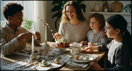 A diverse family enjoying a festive Easter celebration together at home