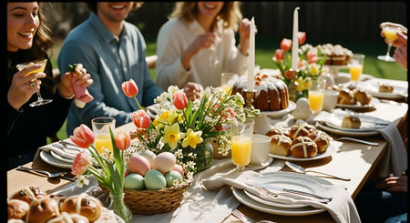 A festive Easter dinner table with people enjoying hot cross buns and flowers