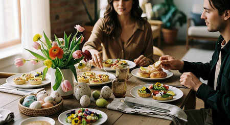A couple enjoying a festive Easter meal together at home