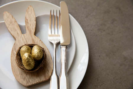 Traditional easter spring meal background. Table setting with bunny and eggs