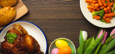Easter food on dark rustic table: pastel colored eggs, roasted chicken, vegetables, buns
