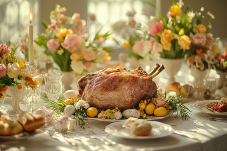A table is set with a large roast chicken and a variety of side dishes, including eggs, bread, and vegetables. The table is surrounded by vases of flowers, creating a warm and inviting atmosphere
