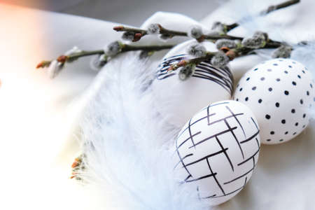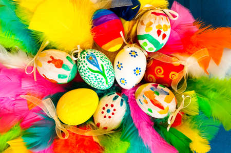 Traditional arrangement of easter eggs and easter feathers
