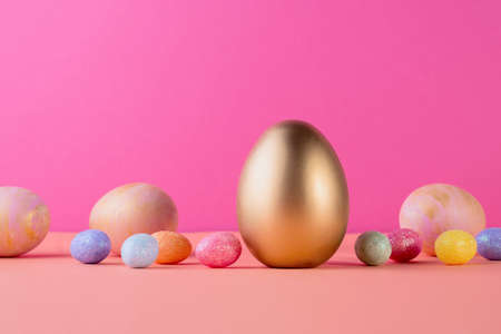 Trendy Easter background with Gold and colored Easter eggs on a light coral color background with copy space for text. Top view flat lay still life. Easter concept.