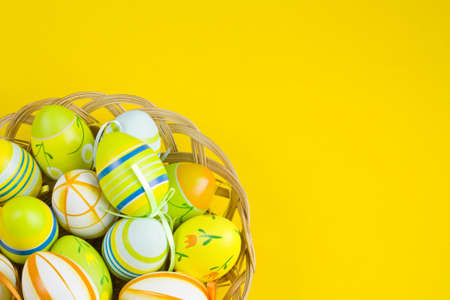painted colorful eggs in a basket for the Easter holiday yellow background.