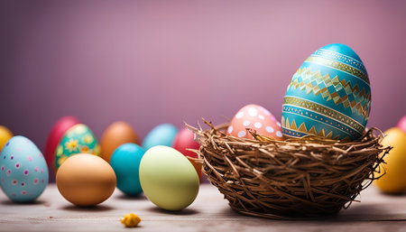 A close-up of colorful Easter eggs in a nest on a wooden table, with a pastel background. The eggs are painted with various patterns and colors, creating a festive and joyful atmosphere.