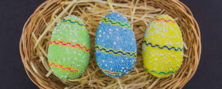 Easter colored eggs in a basket isolated on a trendy black background. Minimal easter concept. Easter card with copy space for text.