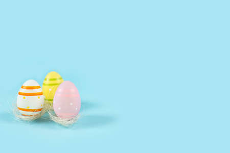 Color Easter eggs in white nest on a blue background.