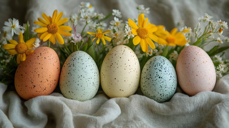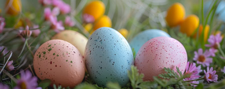 Five pastel-colored speckled eggs rest gently amidst a bed of delicate spring flowers, creating a charming Easter scene.