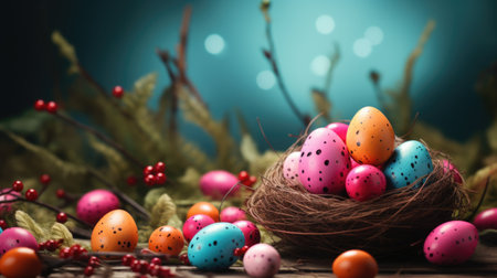 A charming arrangement of colorful Easter eggs placed in a natural straw nest, perfect for spring decorations and festive celebrations.