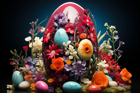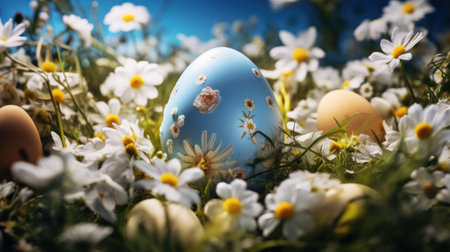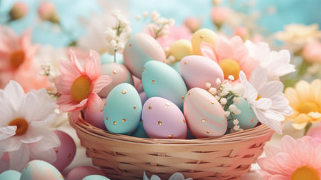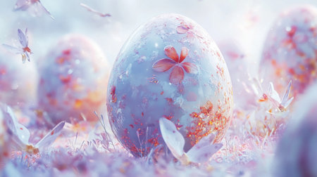 This enchanting image showcases beautifully decorated eggs surrounded by delicate flowers, creating a whimsical atmosphere perfect for spring celebrations.