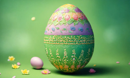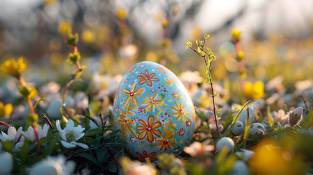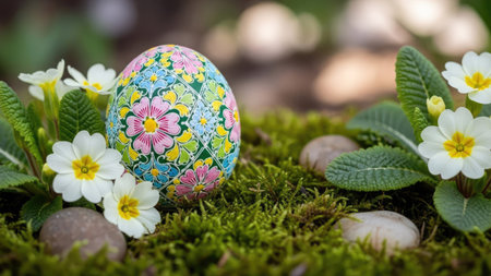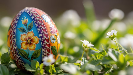 This enchanting image features a beautifully decorated Easter egg with intricate floral patterns, surrounded by fresh flowers in a soft, spring setting.