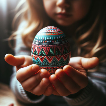 A hand holding a colorful egg with the words Happy Easter written on it. The egg is painted in various colors, and the hand is covered in paint. Concept of joy and celebration