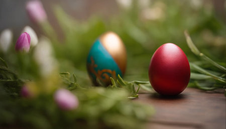 Hand-painted Easter eggs in vibrant colors, surrounded by spring flowers and fresh grass.