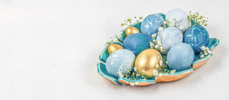 Easter eggs with spring flowers on a blue plate. Happy Easter card. Long banner format. top view. copy space.