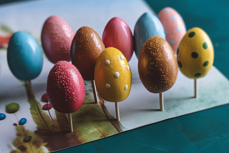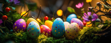 Colorful Easter eggs hidden in a lush spring meadow. A cheerful scene celebrating the Easter holiday.