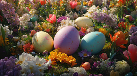 Colorful pastel eggs rest among a variety of blooming flowers in a vibrant garden. The scene captures the essence of spring with bright hues and a joyful atmosphere.