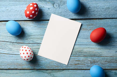 Easter holiday greeting card mockup, old blue wooden background, colored eggs