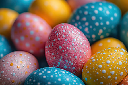 Close-up of colorful Easter eggs with pastel shades and polka dots on pink fabric.