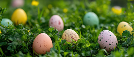 Colorful Easter eggs hidden in a lush spring meadow. A cheerful scene celebrating the Easter holiday.