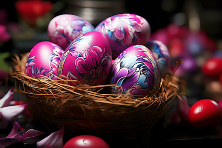 A close-up shot of a nest made from dried palm leaves filled with vibrantly colored Easter eggs. The eggs are decorated with various patterns and designs, creating a festive and joyful atmosphere. This image embodies the spirit of Easter, symbolizing renewal and rebirth.