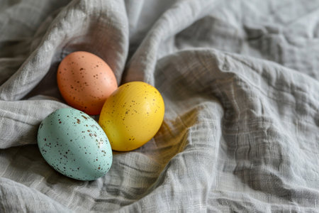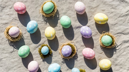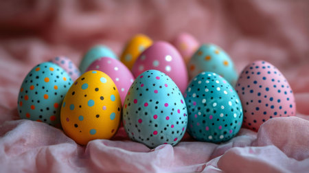 Close-up of colorful Easter eggs with pastel shades and polka dots on pink fabric.