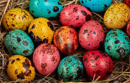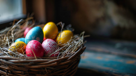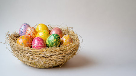 A charming arrangement of colorful Easter eggs placed in a natural straw nest, perfect for spring decorations and festive celebrations.