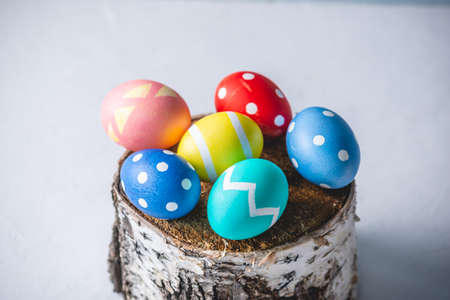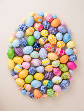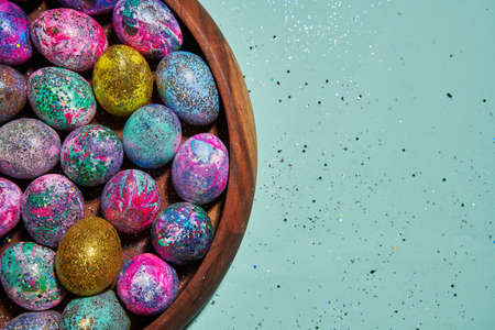 holiday preparation Multi colors Easter eggs on colored background . Pastel color Easter eggs. holiday concept with copy space.