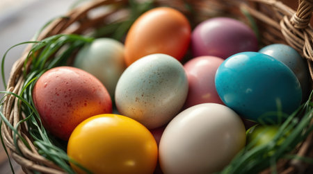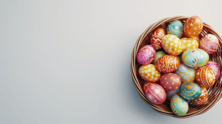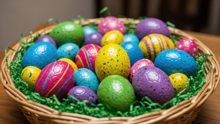 A vibrant collection of colorful Easter eggs nestled in a woven basket, perfect for spring celebrations and festive decor. Ideal for showcasing holiday spirit.