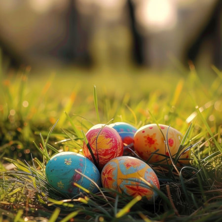 A basket full of colorful Easter eggs rests on a bed of lush green grass, with the warm glow of spring sunshine illuminating the scene.
