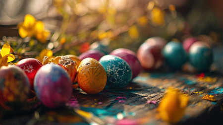 Happy Easter.Colorful hand painted decorated Easter eggs. Handmade Easter craft.Spring decoration background. DIY Festive traditional symbols.Holiday Still life photo selective focus. AI Generative.