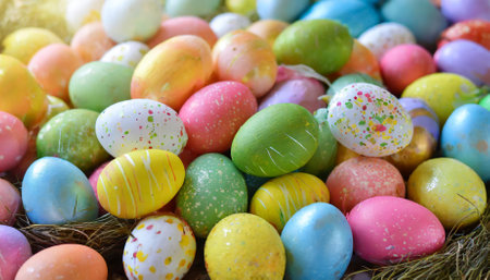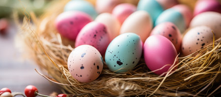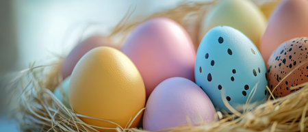Colorful pastel Easter eggs nestled in a bird's nest, symbolizing springtime and new beginnings.