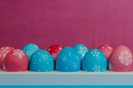 Colorful, painted for Easter, chicken eggs lie in a row on a blue background.