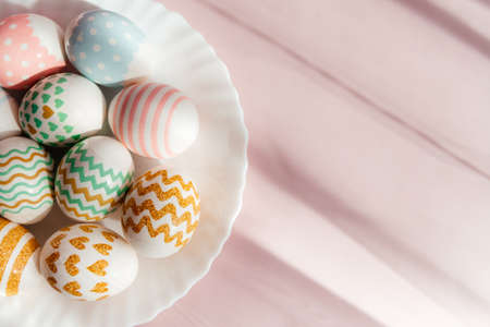 Easter eggs in pastel colors with a pattern lie on a white plate