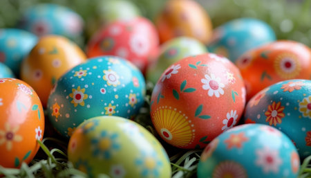 A close-up image of colorful Easter eggs, decorated with floral patterns and lying in a bed of green grass.