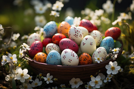 A vibrant collection of colorful Easter eggs nestled among delicate flowers in a sunny spring meadow, evoking a sense of joy and celebration.