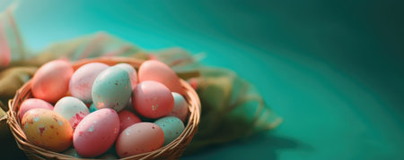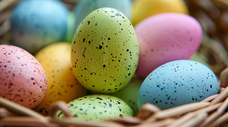 A charming wicker basket filled with pastel-colored Easter eggs, ready for a springtime celebration.