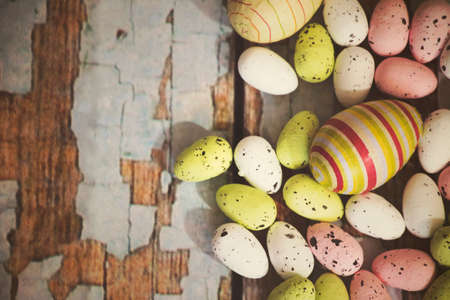 Top view of blurred dark background with Easter eggs and bokeh on a shiny surface.The artistic intend and the filters. Film style