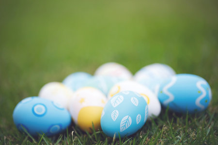 Collection of colorful easter eggs on green grass to celebrate Easter or spring.